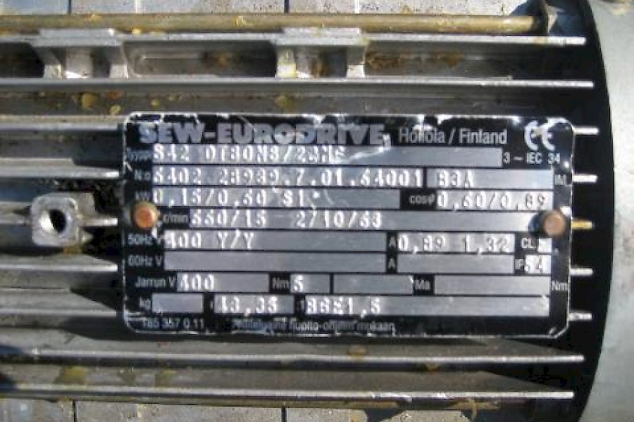 SEW Eurodriven valmistama sähkömoottori kahdella nopeusalueella. S42 DT80N8/2BMG. N:o 6402 28939.7.01.64001.B3A, 660/15, 2710/63 r/min 400V, 0,89/1,32A Akselin halkaisia 12mm.