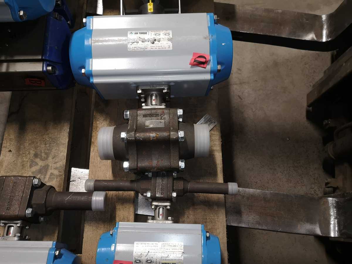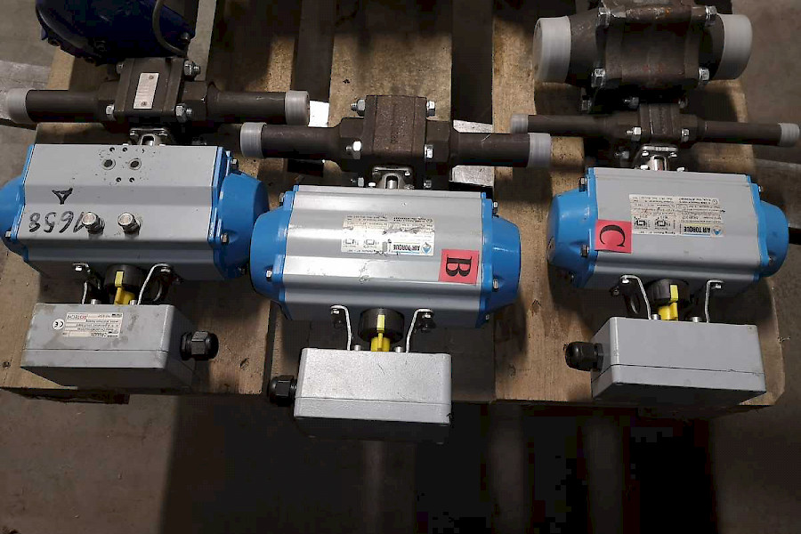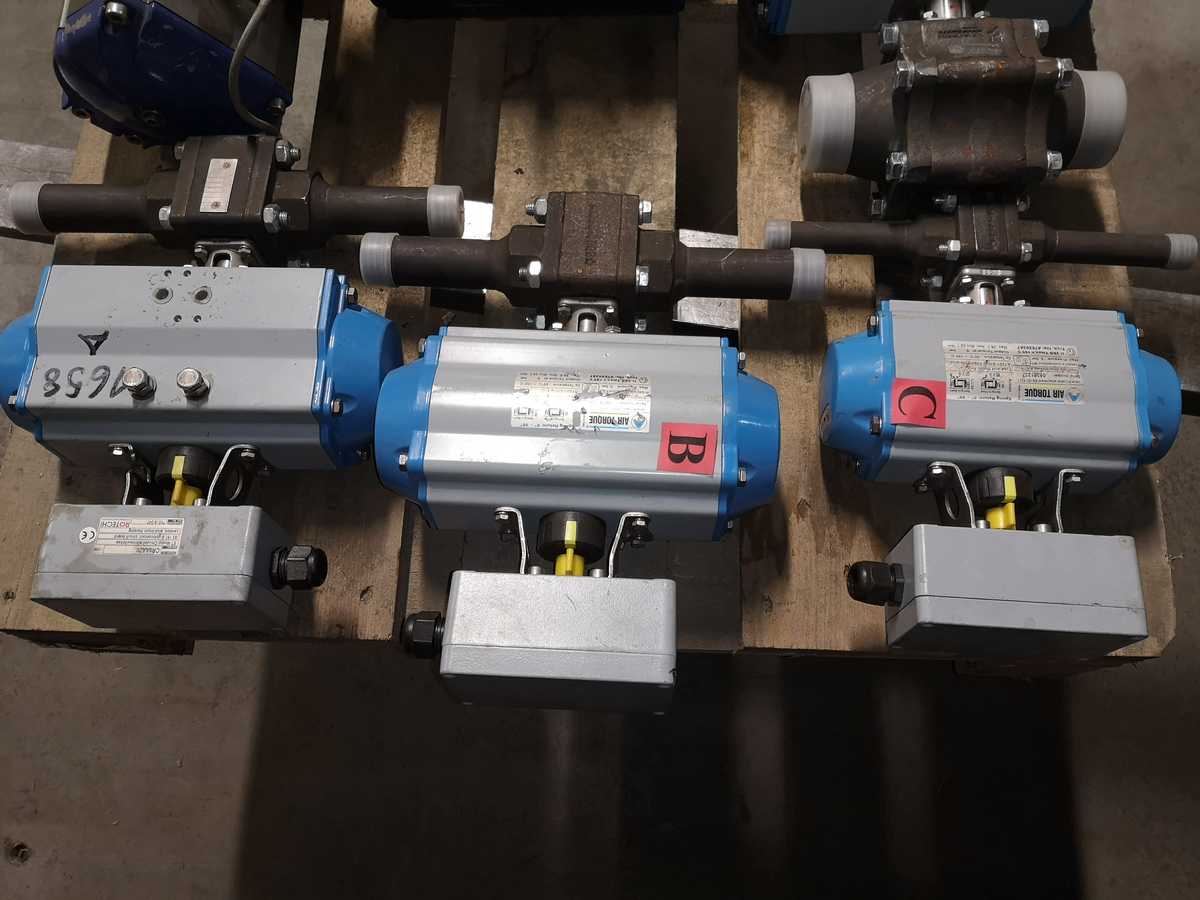 A:Air Torque, EN ISO 5211, Serial num. 05197113, AA1, Pressure connection B1. Max pressure 8bar.Type and Model: Part Turn AT251 S10 B F05/F07-N-D-17. Op. temperature -20 +80C. Output torque at 5bar. Max. 54,8 Nm, min 36,7Nm. Venttiili-osa: Type 123-SGS, DN25. +microswitch CR8AAZ0. B: Air Torque, EN ISO 5211, Serial num. 05197106, AA1. Pressure connection B1, Max pressure 8bar. Type and Model: Part Turn AT251 S10 B F05/07-N-D-17. Op. temperature -20 +80C. Out put torque at 5bar. Max 54,8 Nm, min 36,7 Nm. Microswitch Model Nr. CR8AAZ0. Venttiili: Type 123 SES. C: Air Torque, EN ISO 5211, Serial num. 05081237, AA1. Pressure connection B1. Max Pressure 8 bar. Type and Model: Part Turn AT201 S10 B F05/F07-N-D-17. Op. Temperature -20 +80C. Out put torque at 5bar, Max. 36,1 Nm, min 22,1 Nm. Venttiili: Type 125SGS. Microswitch Model Nr. CR8AAZ0. D: Air Torque, EN ISO 5211, Serial num. 05122511, AA2. Pressure connection B2, Max pressure 8bar. Type and Model: Part Turn AT351 S10 B F07/F10-N-D-22. Op. Temperature -20 +80C. Out put torque at 5bar, Max. 133Nm, min 82Nm. Venttiili: Type 113-SGS-G. Microswitch: Model CR8AAZ0.