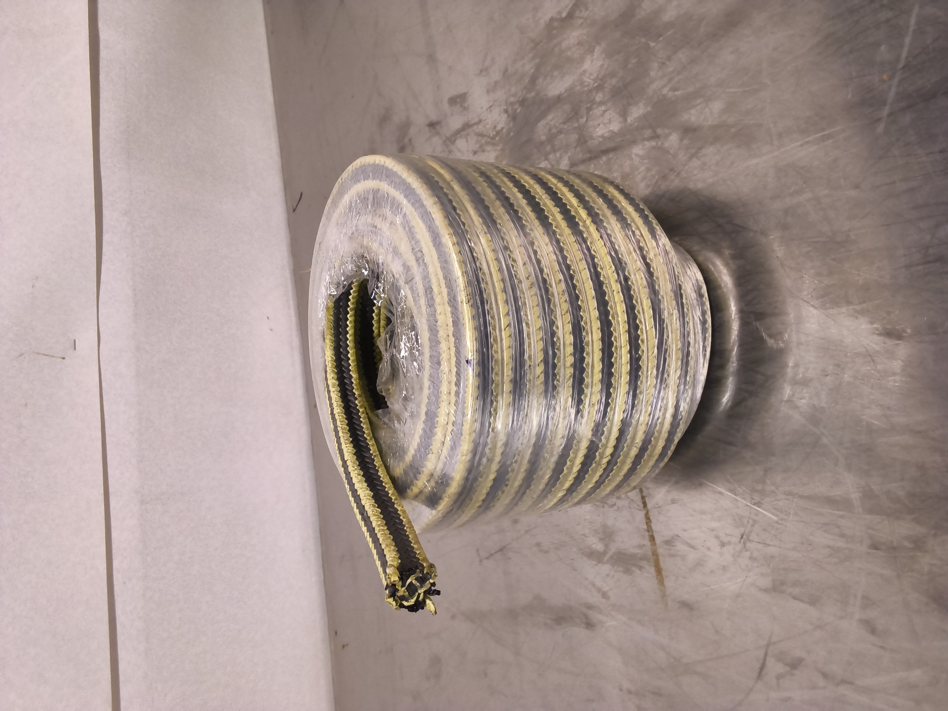 - Materiaali: Tiiviste koostuu grafiittipitoisesta PTFE-langasta (teflon), ja sen kulmat on vahvistettu keltaisella aramid-tai Kevlar-kuidulla.