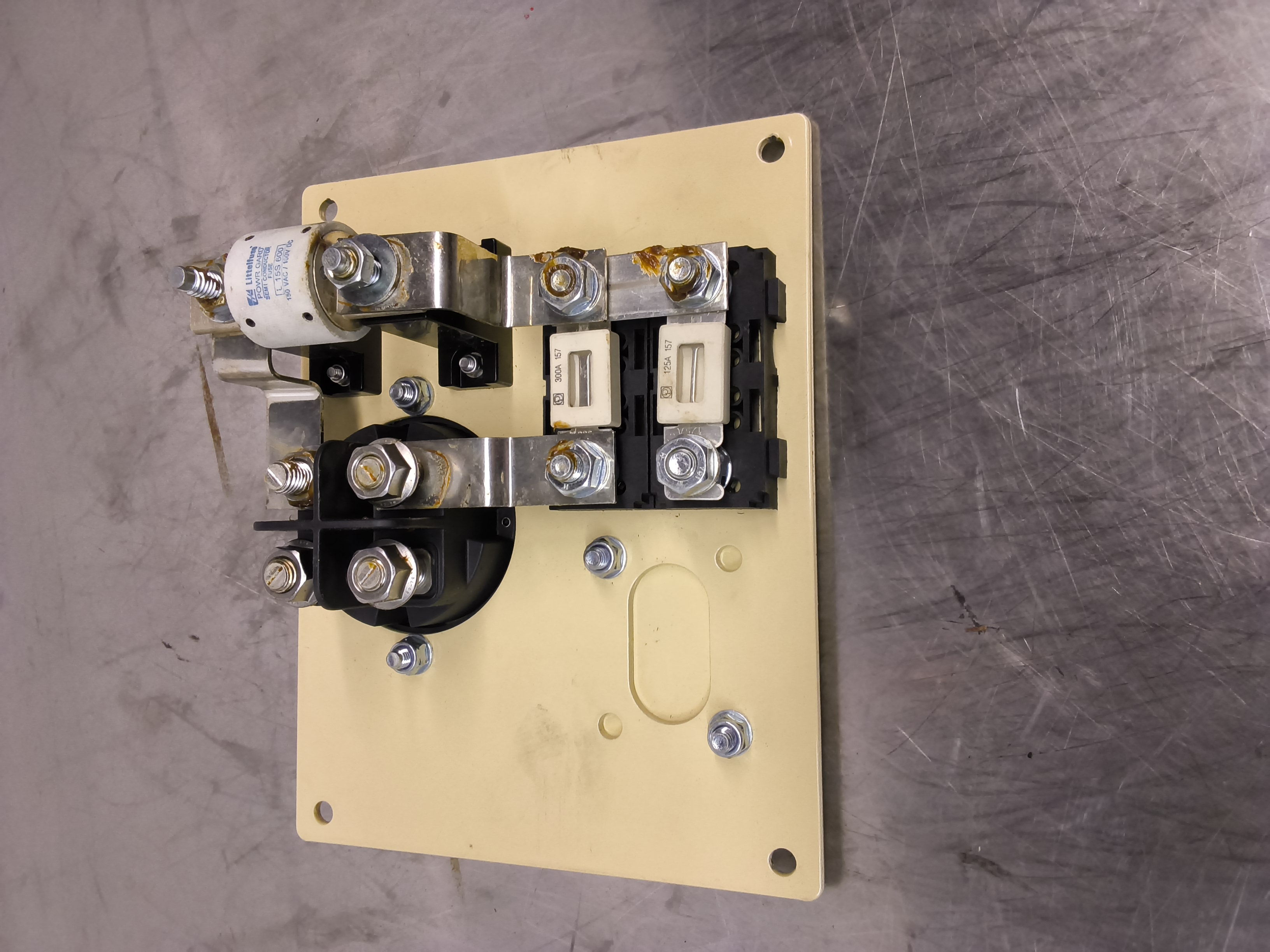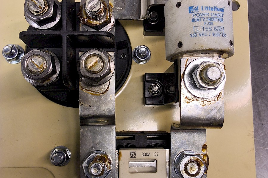 • Virtakiskot (Busbars): Komponentit on yhdistetty toisiinsa metallisilla kiskopalasilla, jotka on kiinnitetty pulteilla ja muttereilla. Osassa liitoksia näky ruskea suojarasvaa, joka estää korroosiota ja parantaa sähkönjohtavuutta.