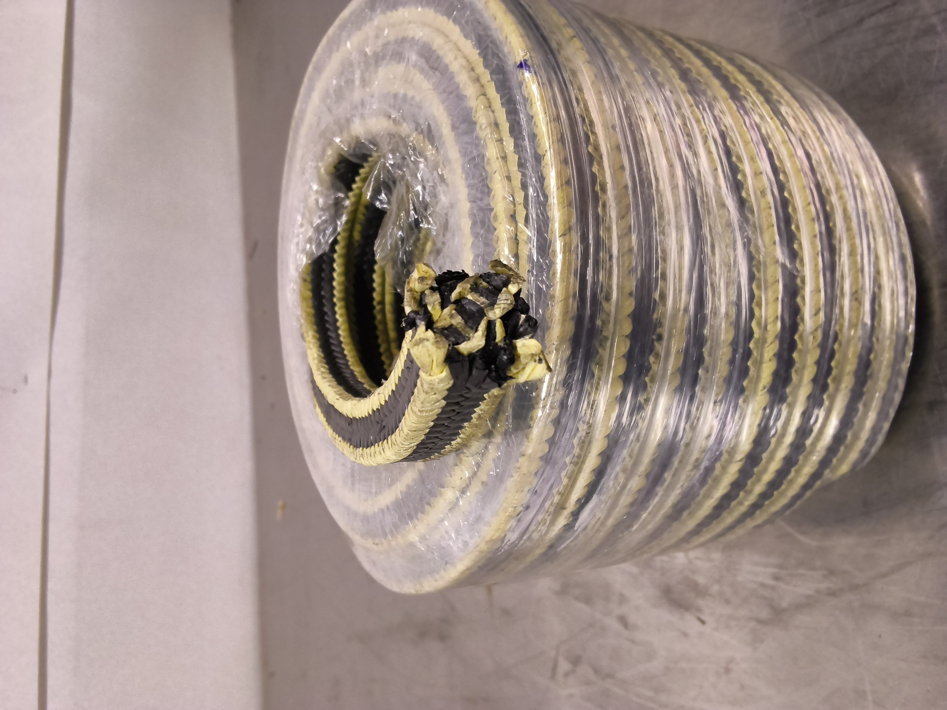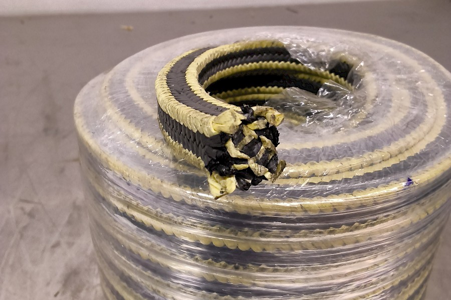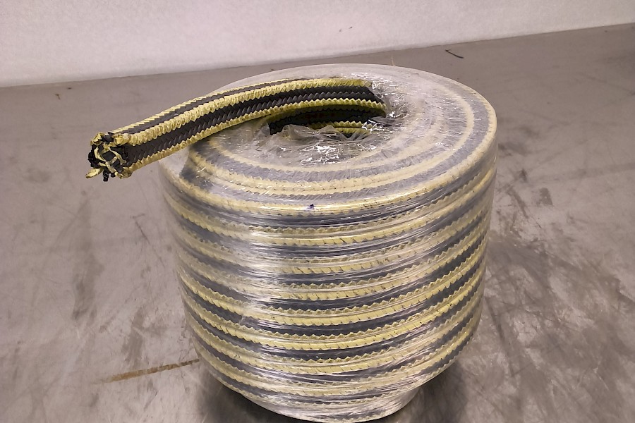 - Materiaali: Tiiviste koostuu grafiittipitoisesta PTFE-langasta (teflon), ja sen kulmat on vahvistettu keltaisella aramid-tai Kevlar-kuidulla.