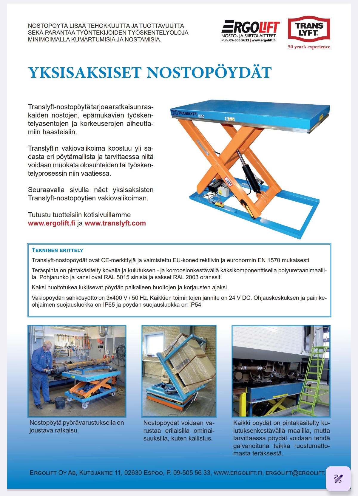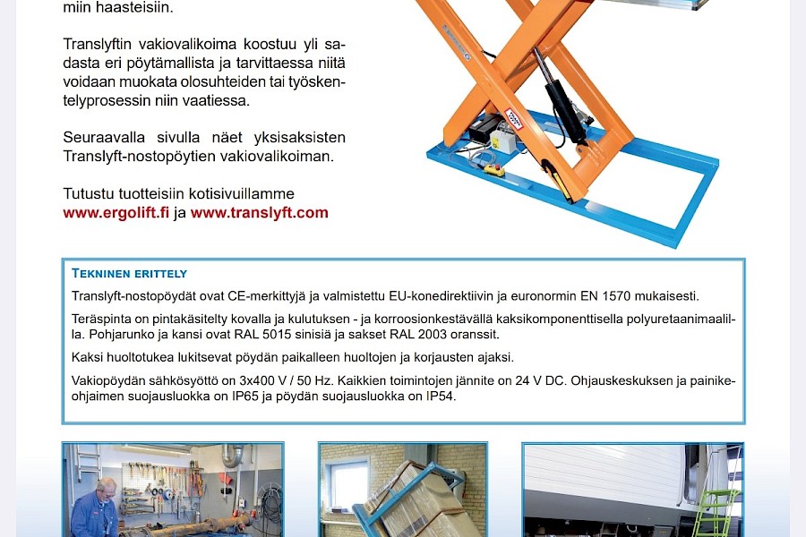 Translyft-nostopöydät ovat CE-merkittyjä ja valmistettu EU-konedirektiivin ja euronormin EN 1570 mukaisesti.