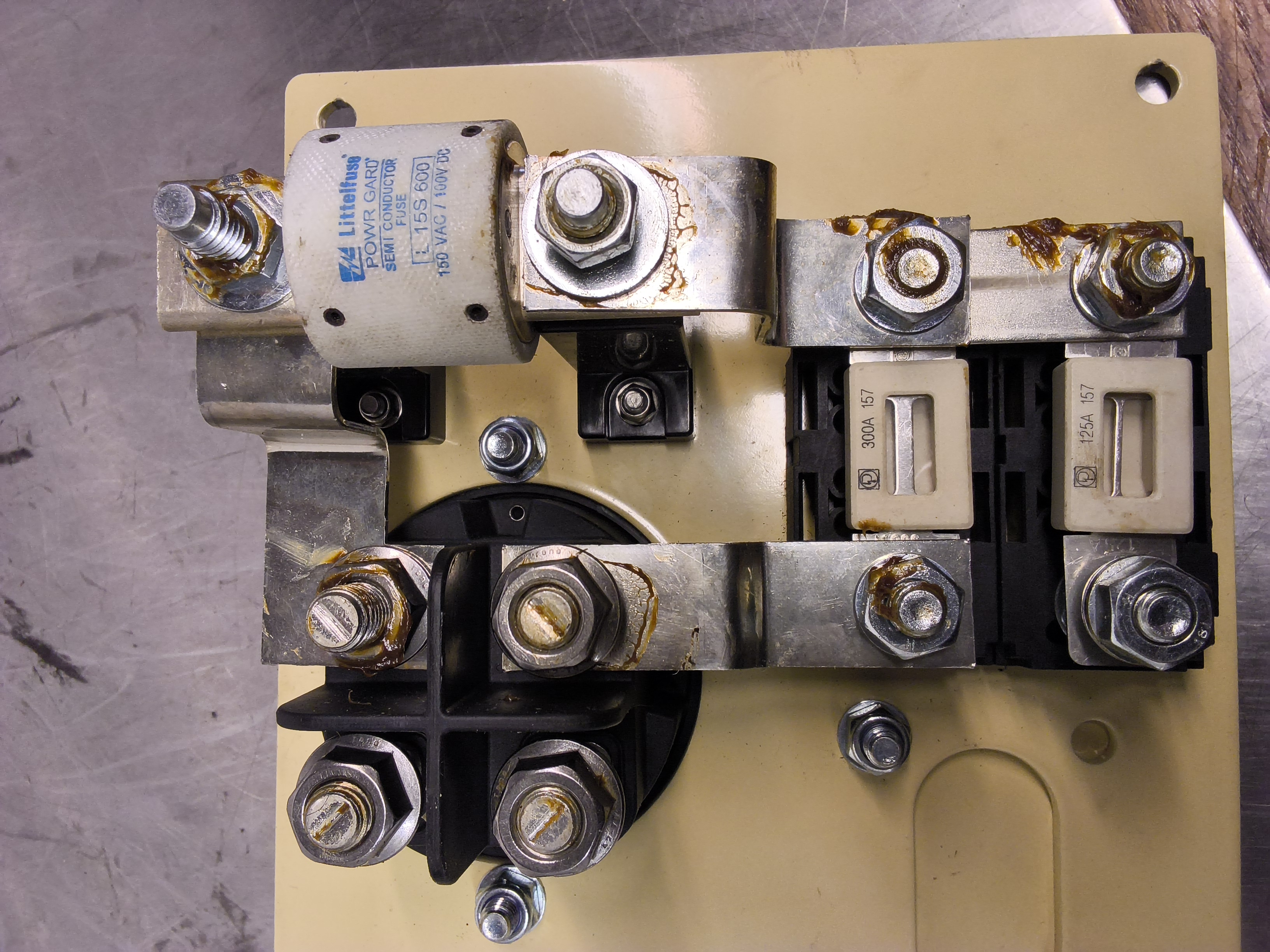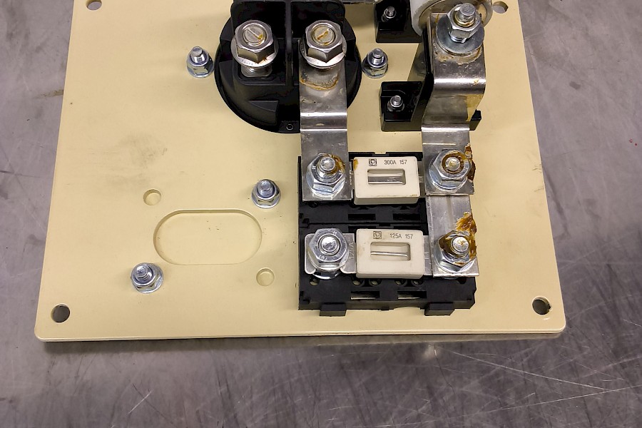 • Virtakiskot (Busbars): Komponentit on yhdistetty toisiinsa metallisilla kiskopalasilla, jotka on kiinnitetty pulteilla ja muttereilla. Osassa liitoksia näky ruskea suojarasvaa, joka estää korroosiota ja parantaa sähkönjohtavuutta.
